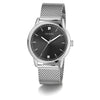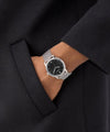 A sleek silver-tone analog watch that blends vintage luxury with modern flair. Its 40 mm polished recycled steel case houses a black sunray dial crowned by a lab-grown diamond at 12 o’clock. The self-adjusting mesh bracelet offers comfortable wear, while quartz precision and 30 m water resistance keep time reliably. Perfect for the stylish gentleman who values effortless elegance.