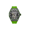 Dayton doesn't just follow trends; it sets them. This automatic timepiece boasts an unapologetic silver case, crafted from polished and brushed aluminum and stainless steel, demanding attention. Its black brushed see-through dial reveals intricate mechanics, while white markers ensure clear visibility. A bold ion-plated black topring and matching green-detailed crown complete its impactful design, finished with a vibrant green silicone strap.